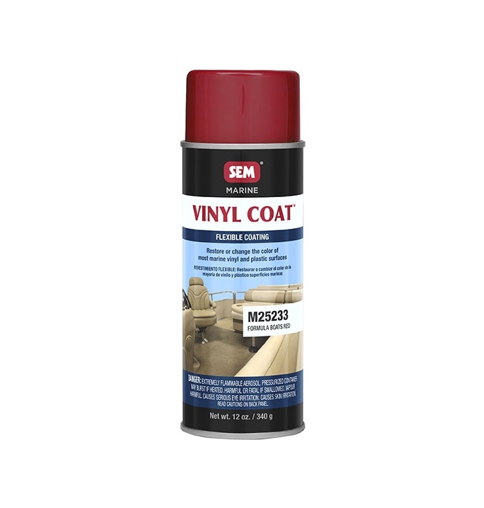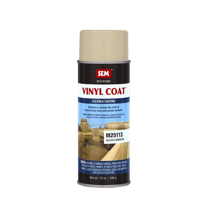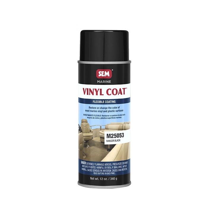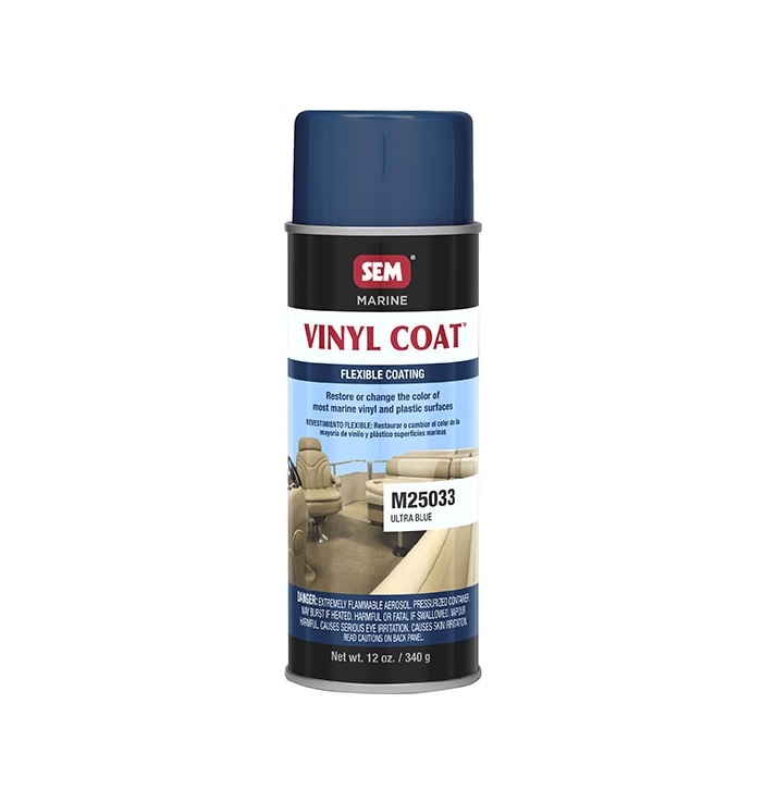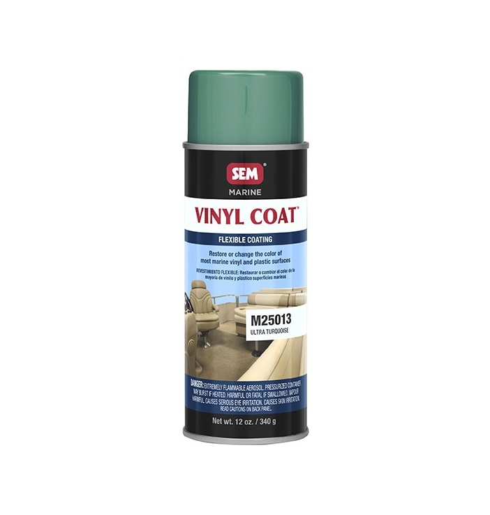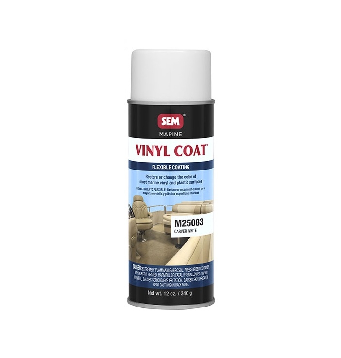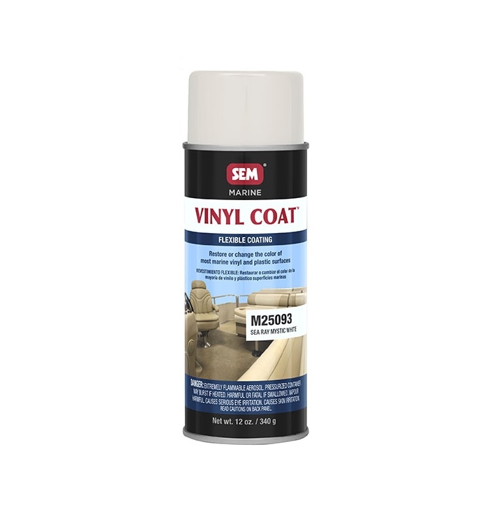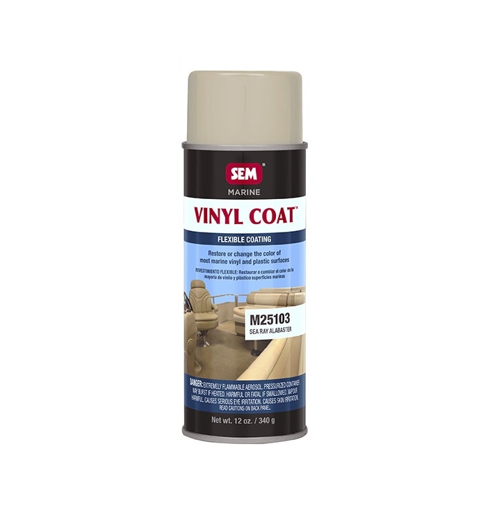 Marine Coat Details: SEM Marine Vinyl Coat (12 oz Aerosol Can) covers approximately 10 square feet. SEM Marine Vinyl Coat is not a dye, but a fade-resistant flexible and permanent coating, specially designed to restore or change the color of Marine Vinyl and Plastic. It is used for but not limited to Boat Seats, Pads, and Dashes.